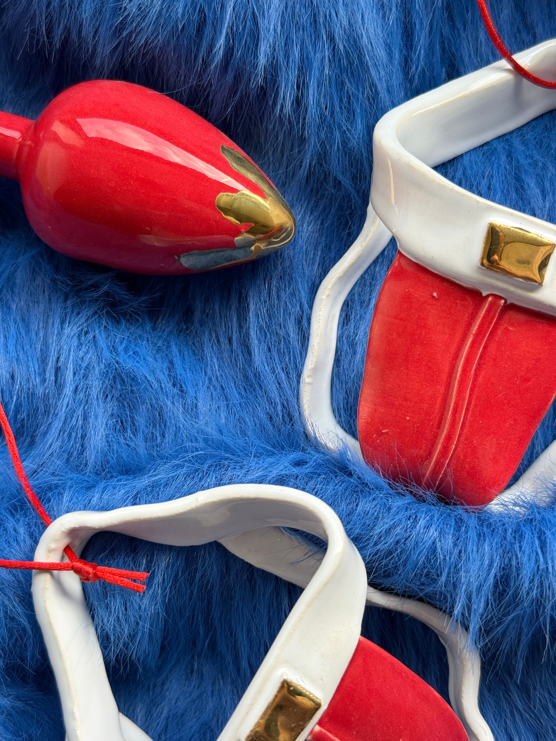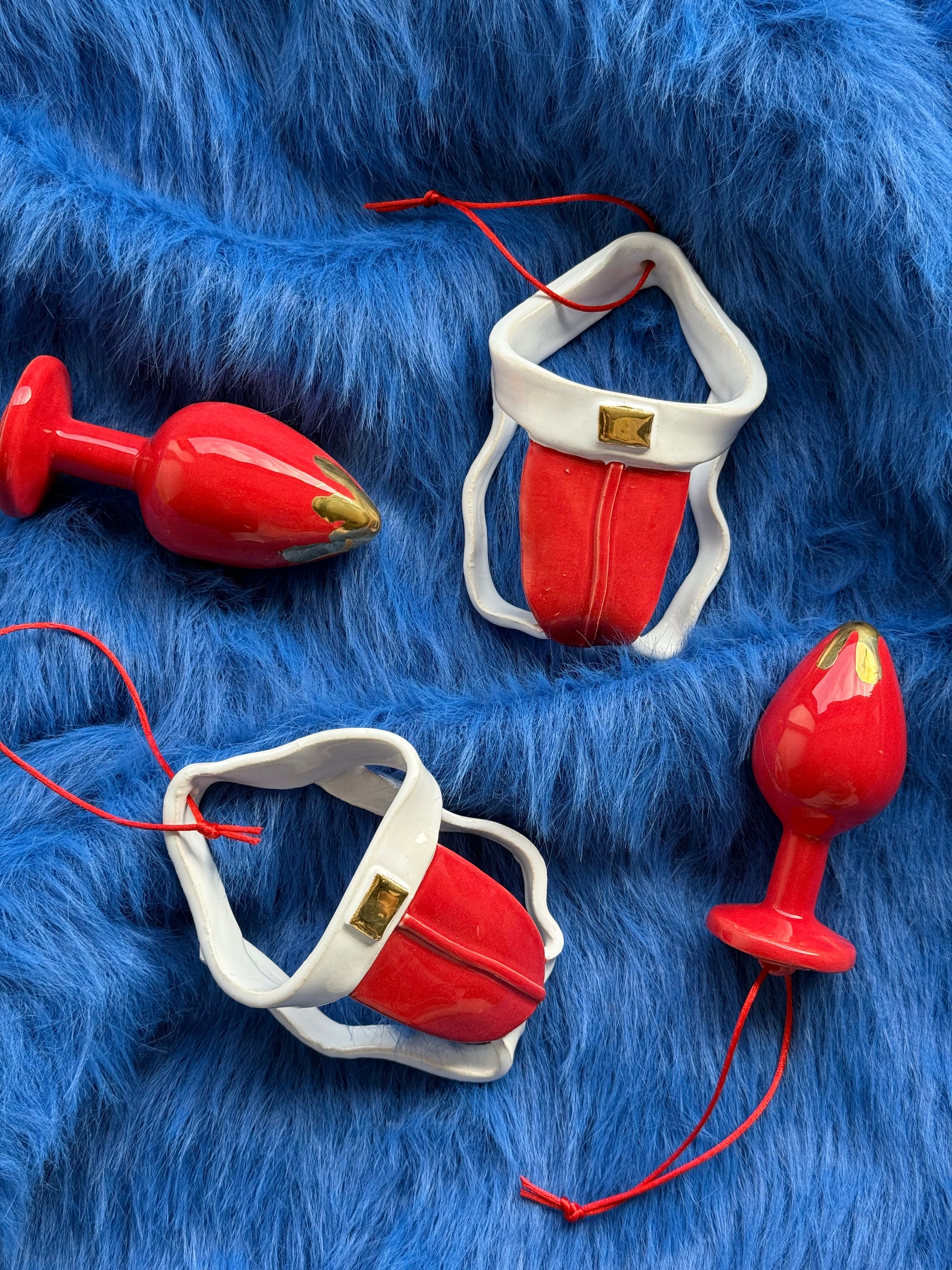 Handmade Christmas tree decorations. The set includes two jacks and two plugs